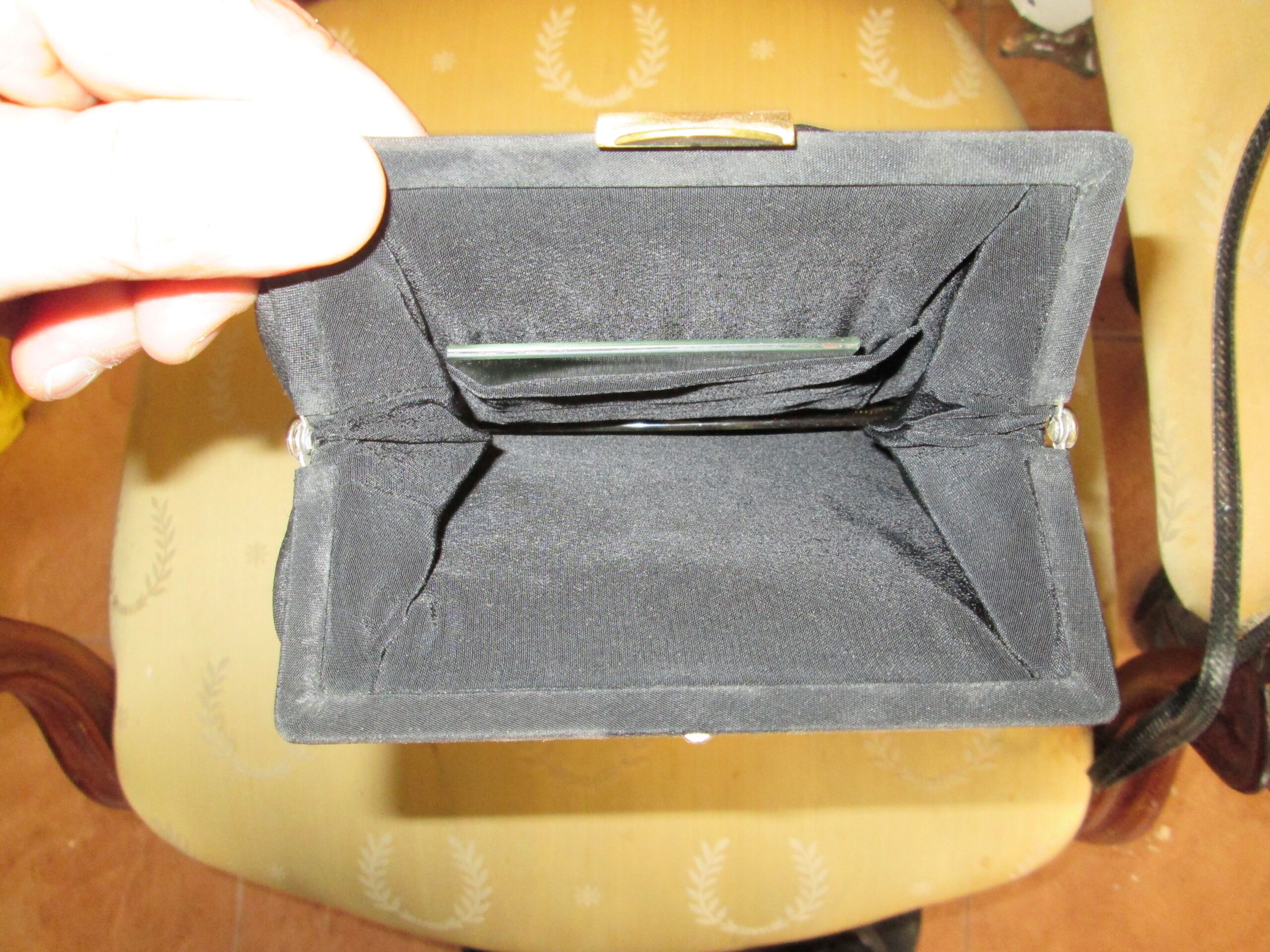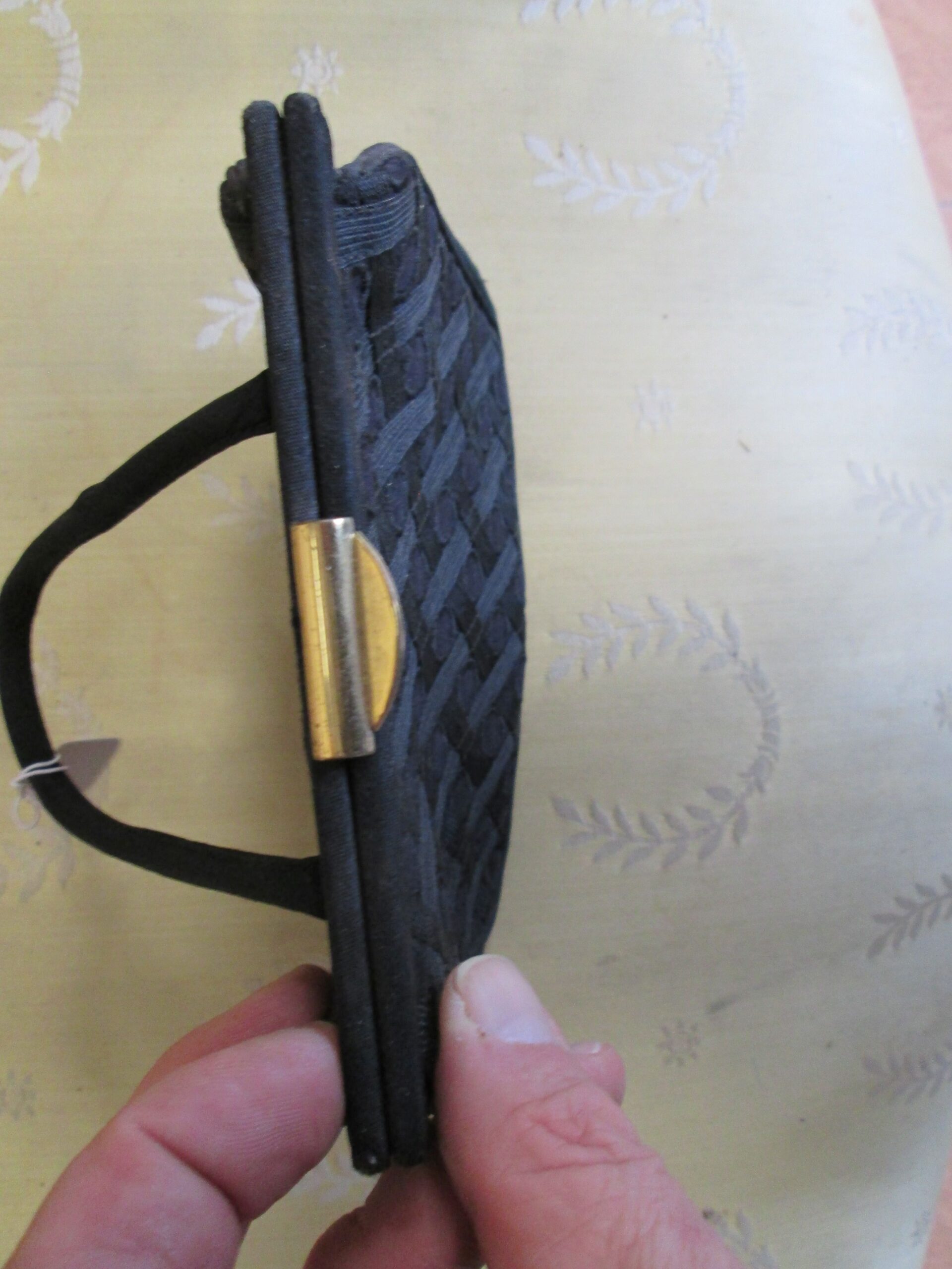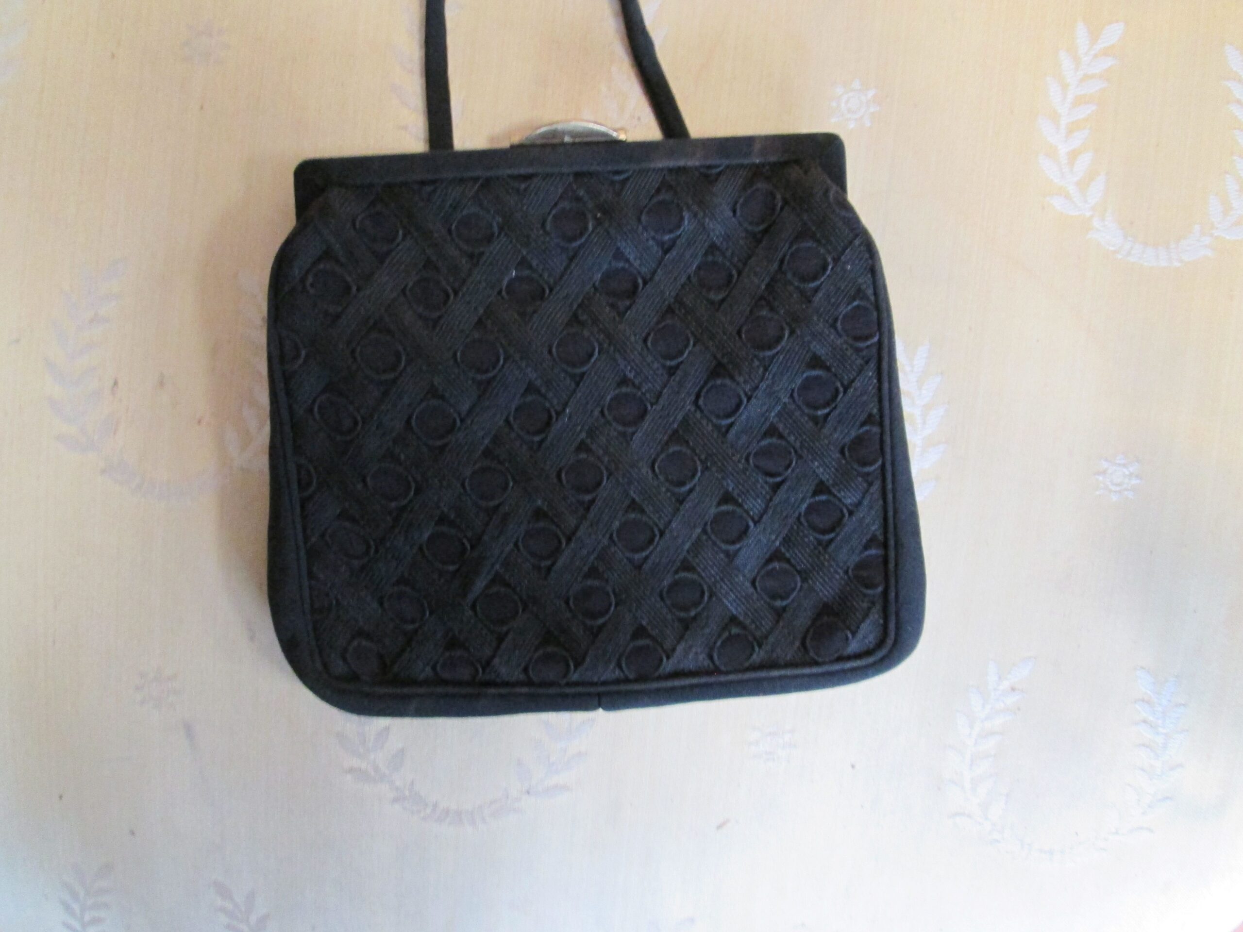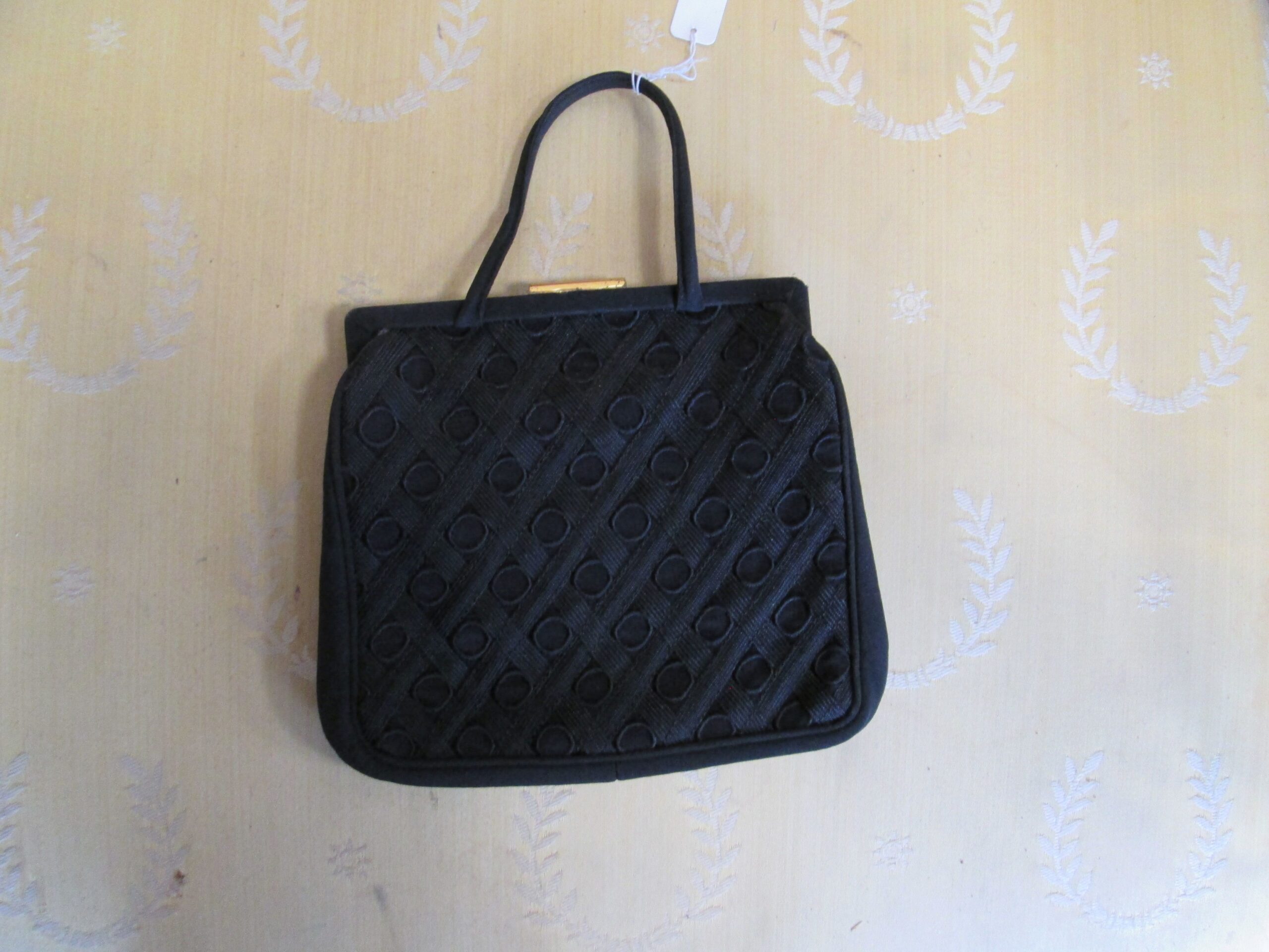 Ciekawa torebka z lat 60-70 tych ubiegłego wieku. Wykonana ze wzorzystego materiału . Elementy okuć z mosiądzu. Zapięcie sprawne , jedno stronny uchwyt do noszenia. Typowa wieczorowa torebka wzorem przypominająca torebki noszone przez Jacqueline Kennedy Onassis . Szerokość 17 cm , wysokość 15 cm. Środek w bardzo dobrym stanie.