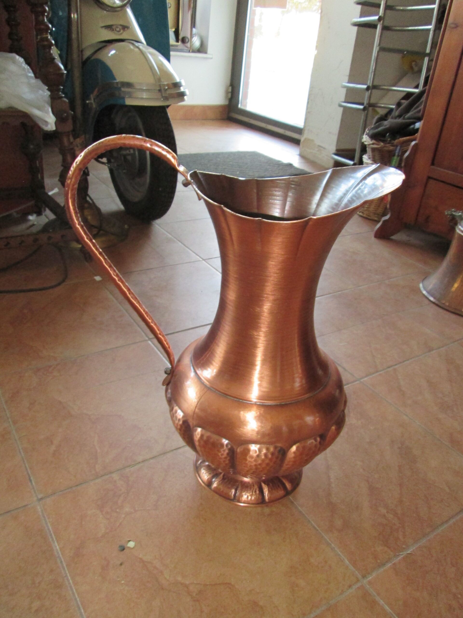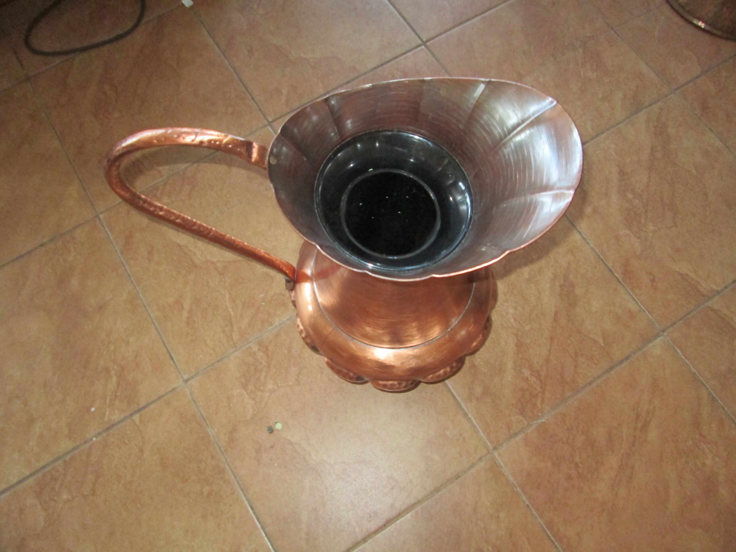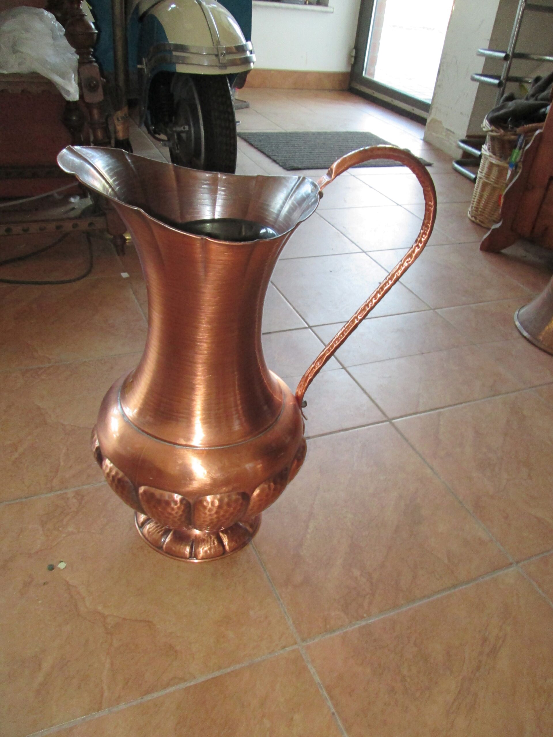 Duży wazon na kwiaty wykonany z miedzi . Młotkowany wzór ma całym dzbanie. Średnica 25 cm , wysokość 47 cm. Dodatkowy wkład .