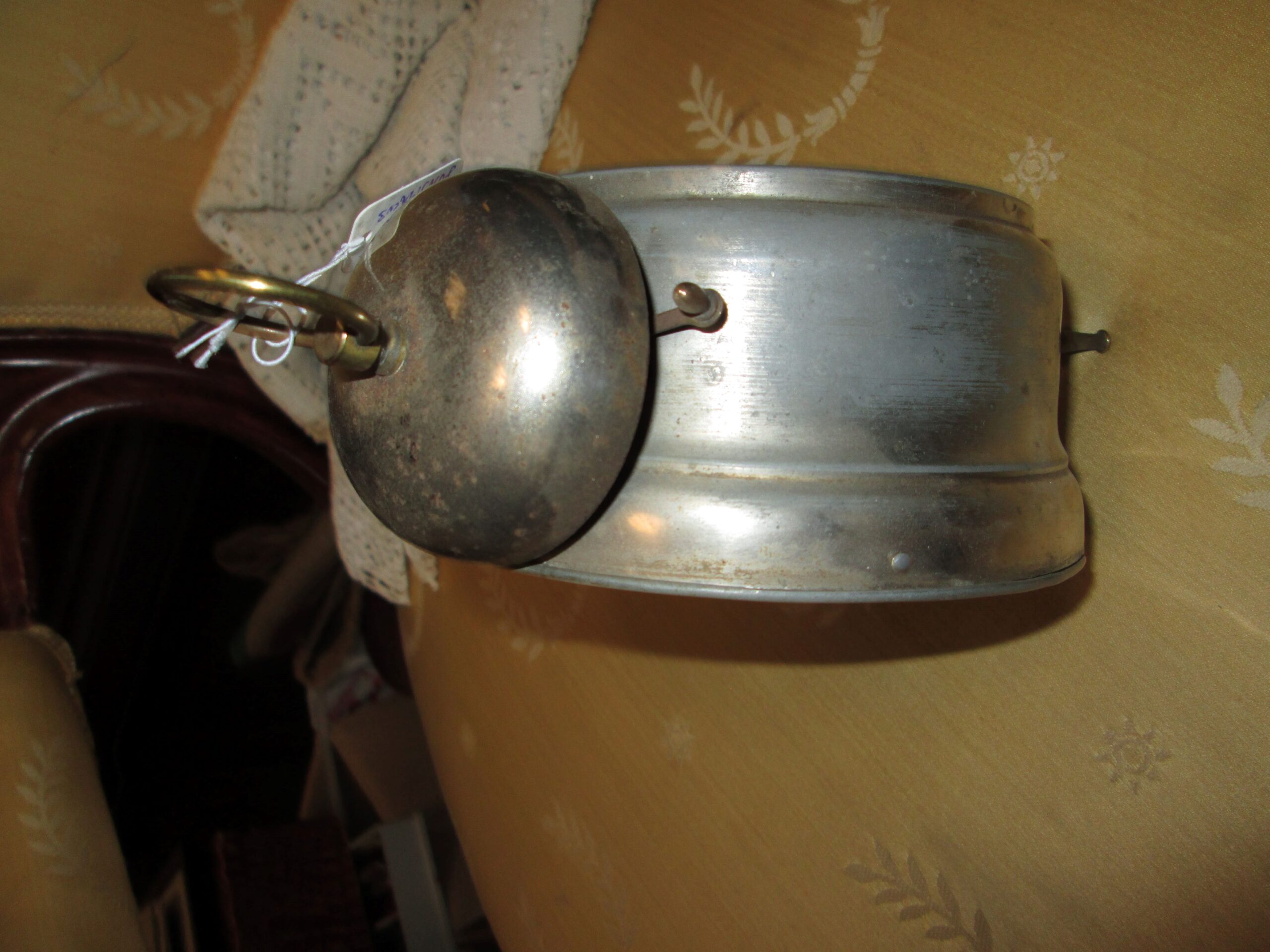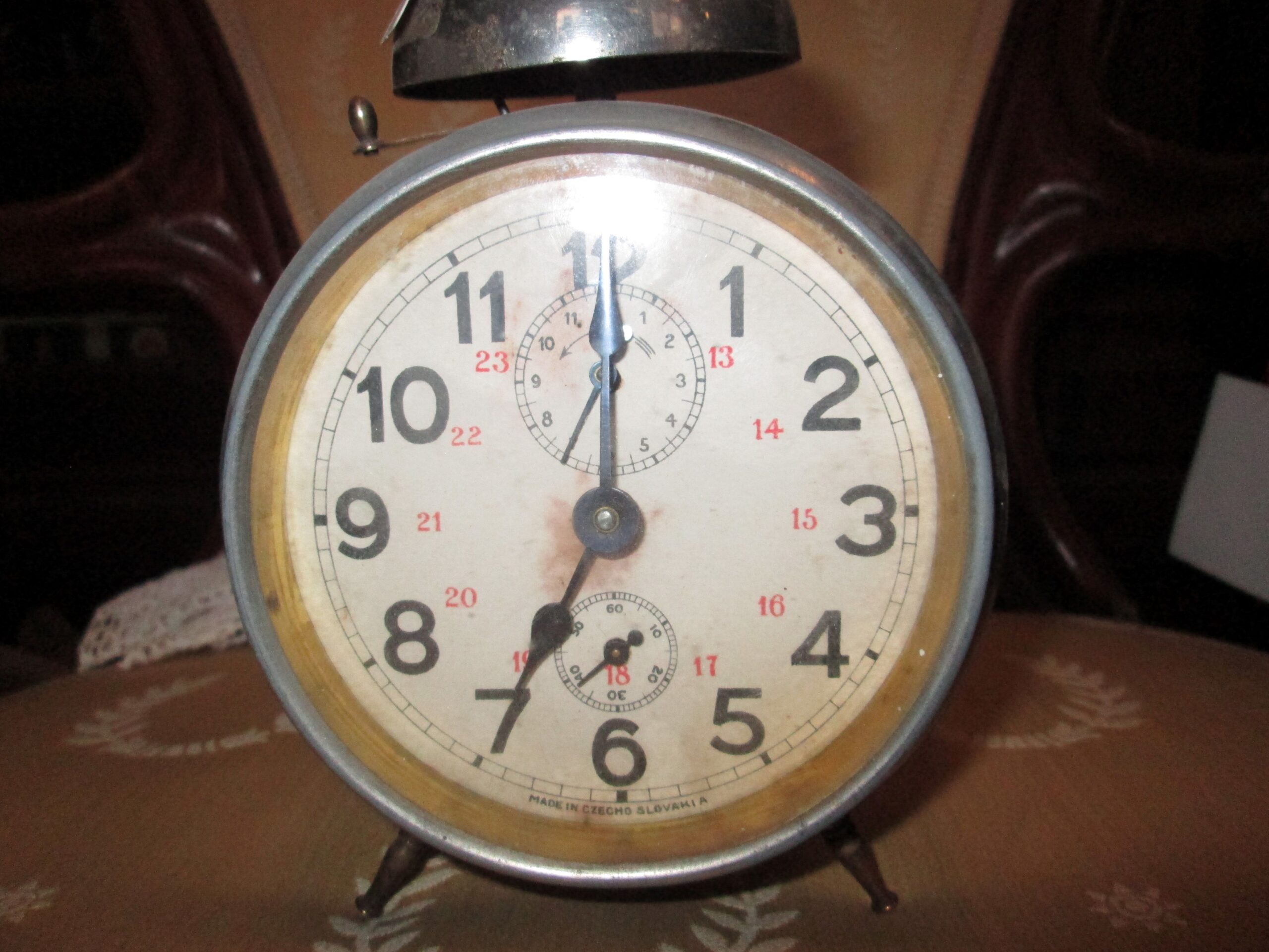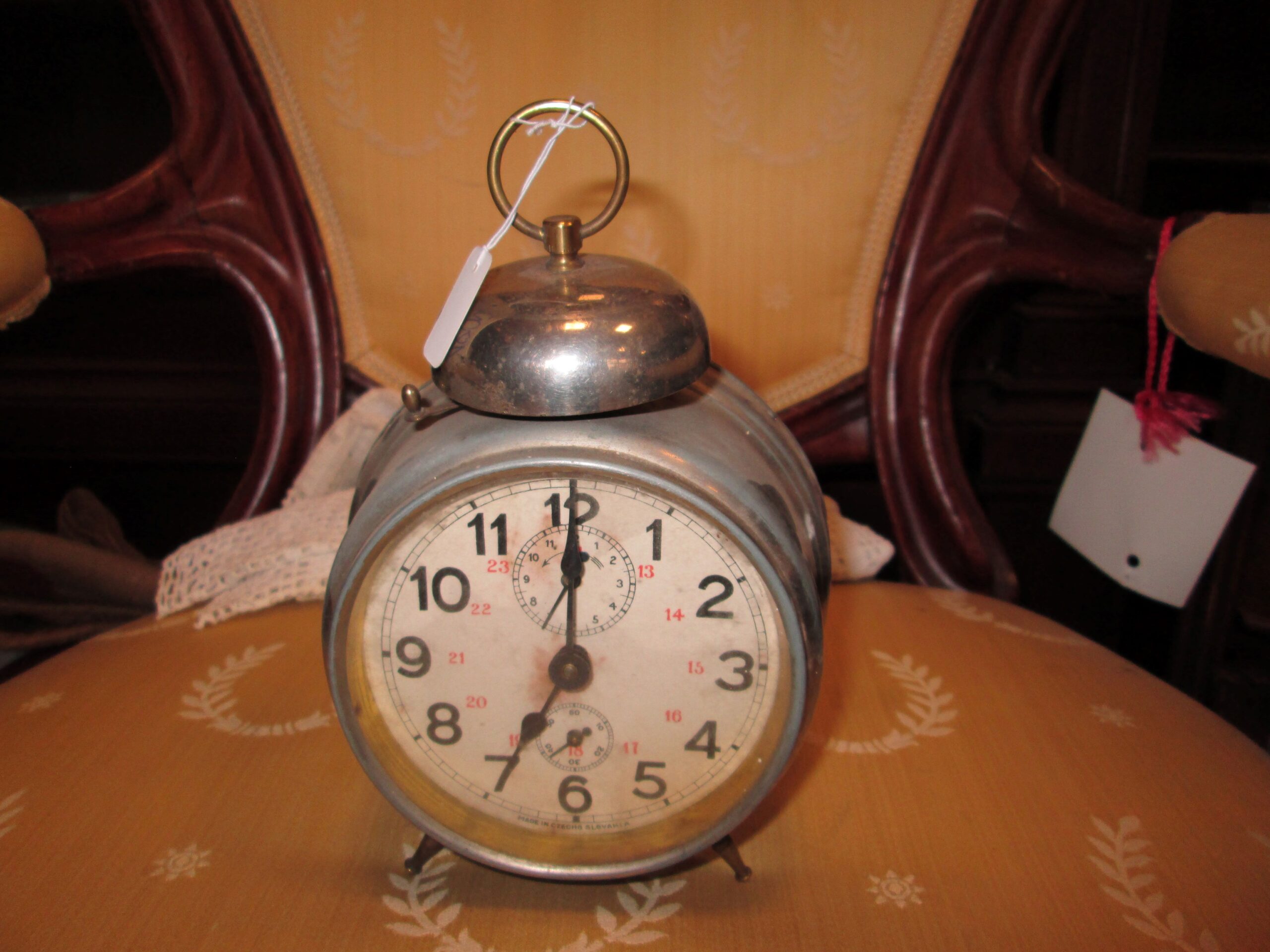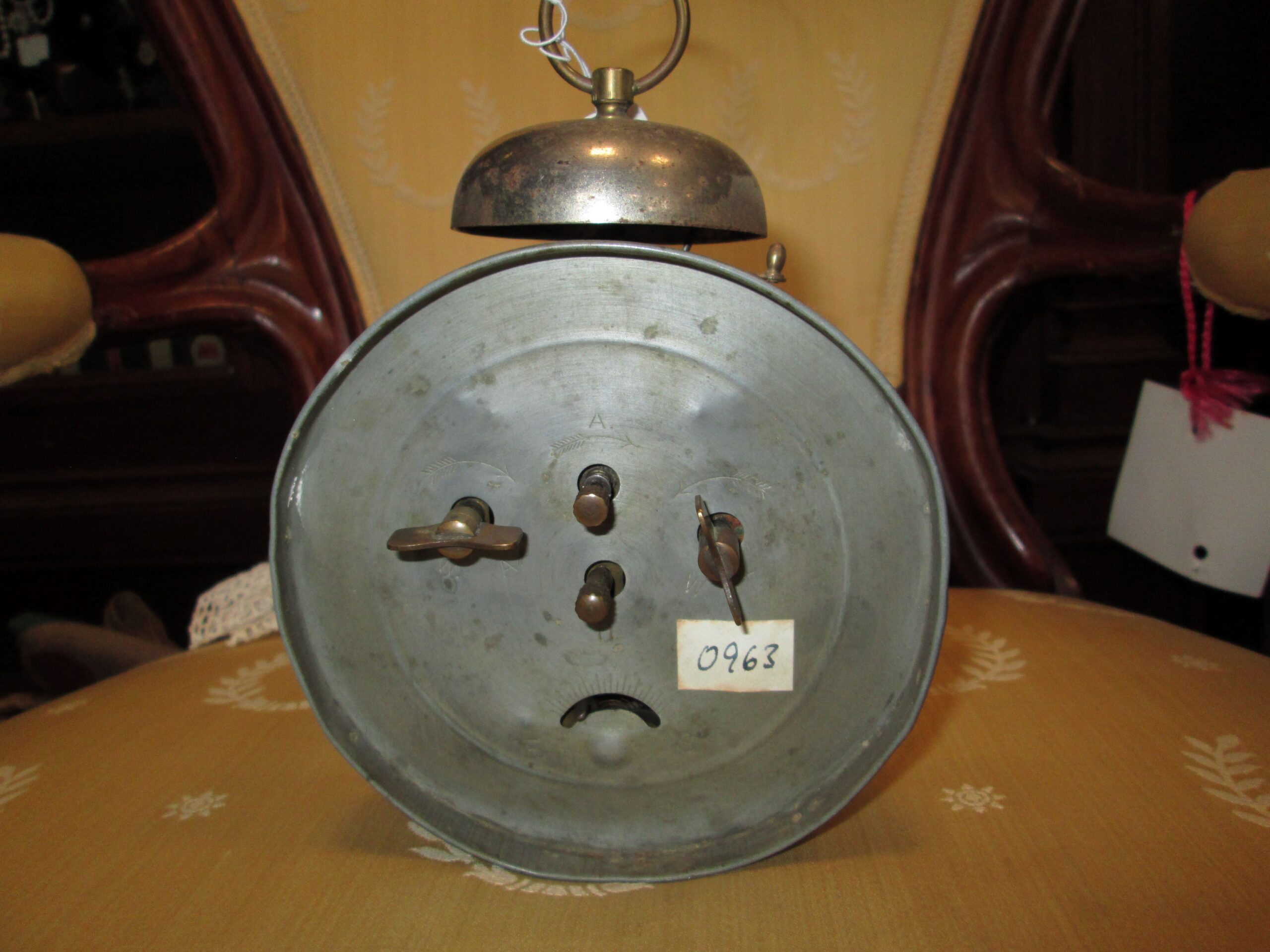 Zegarek budzik z lat 30-tych ubiegłego wieku .Obudowa metalowa. Tarcza papierowa w ładnym stanie. Dzwonek chromowany. Zegarek na chodzie w pełni sprawny (dzwoni). Wysokość z dzwonkiem 18 cm , średnica ok 12 cm , głębokość 6.5 cm. Nr O.