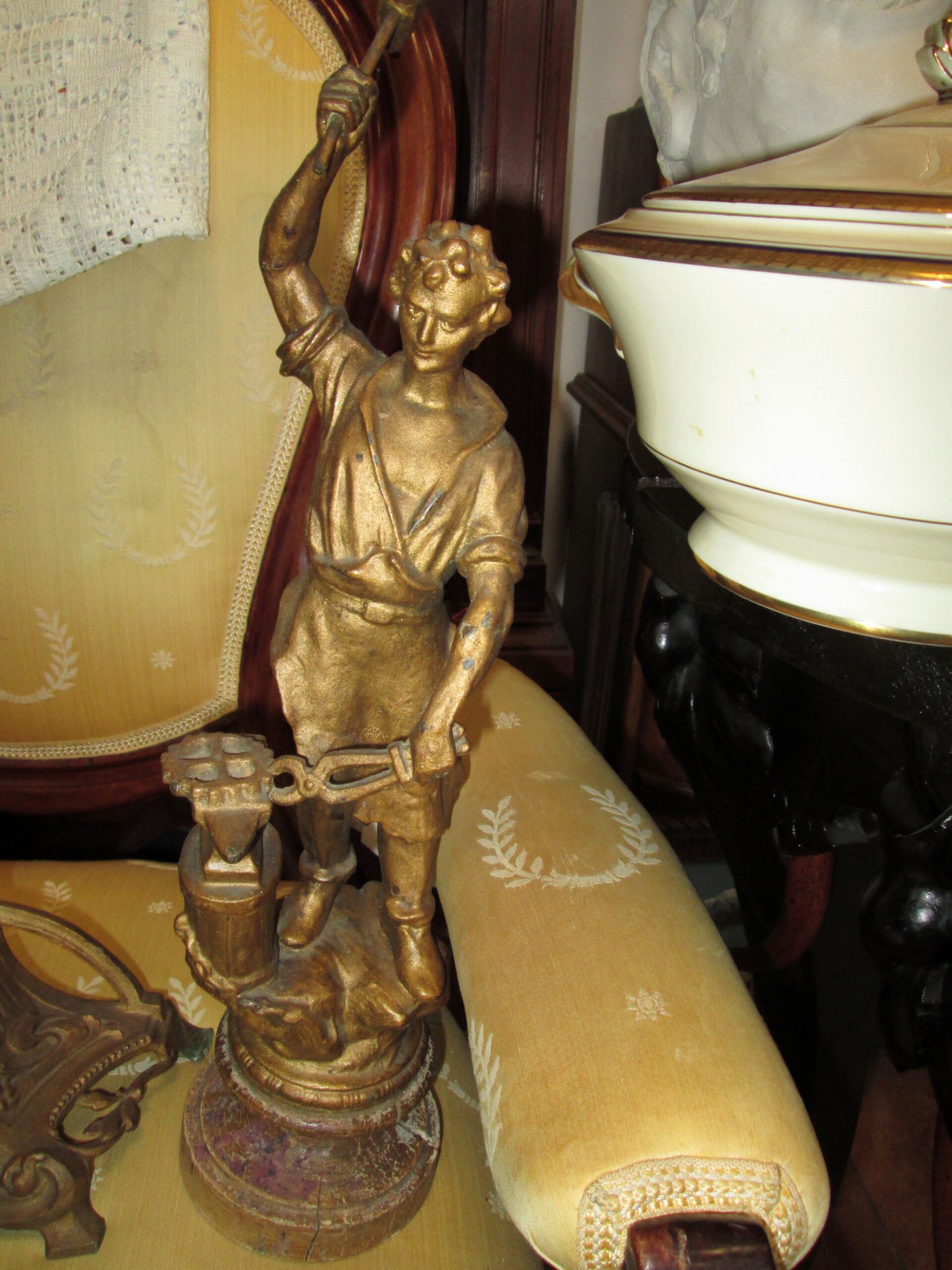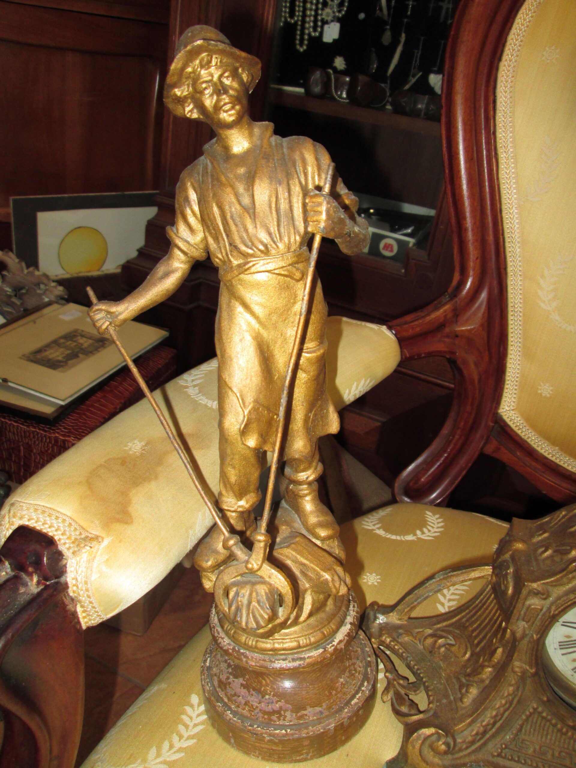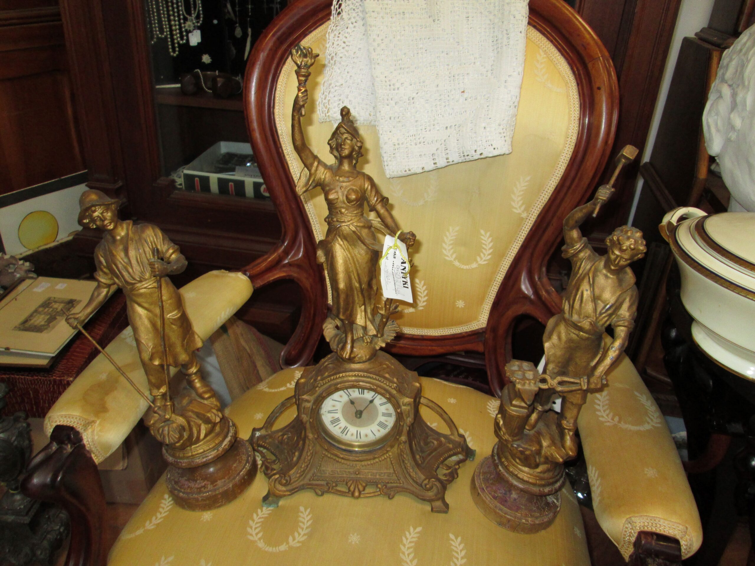 Piękny zegar figuralny wyprodukowany we Francji ok 1900 roku. Obudowa i figury wykonane z cynkalu malowanego na złoty kolor stojące na drewnianych podstawach. Mechanizm to chodzik bez funkcji dzwonka. Obudowa z elementami ozdobnymi typowymi dla okresu secesji. Do zegara w komplecie są dwie figury ,jedna przedstawia kowala , drugi to hutnik. Figura centralna to kobieta z pochodnią. Wysokość zegara z figurą 51 cm , figur bocznych 40 cm. Zegar na chodzie.