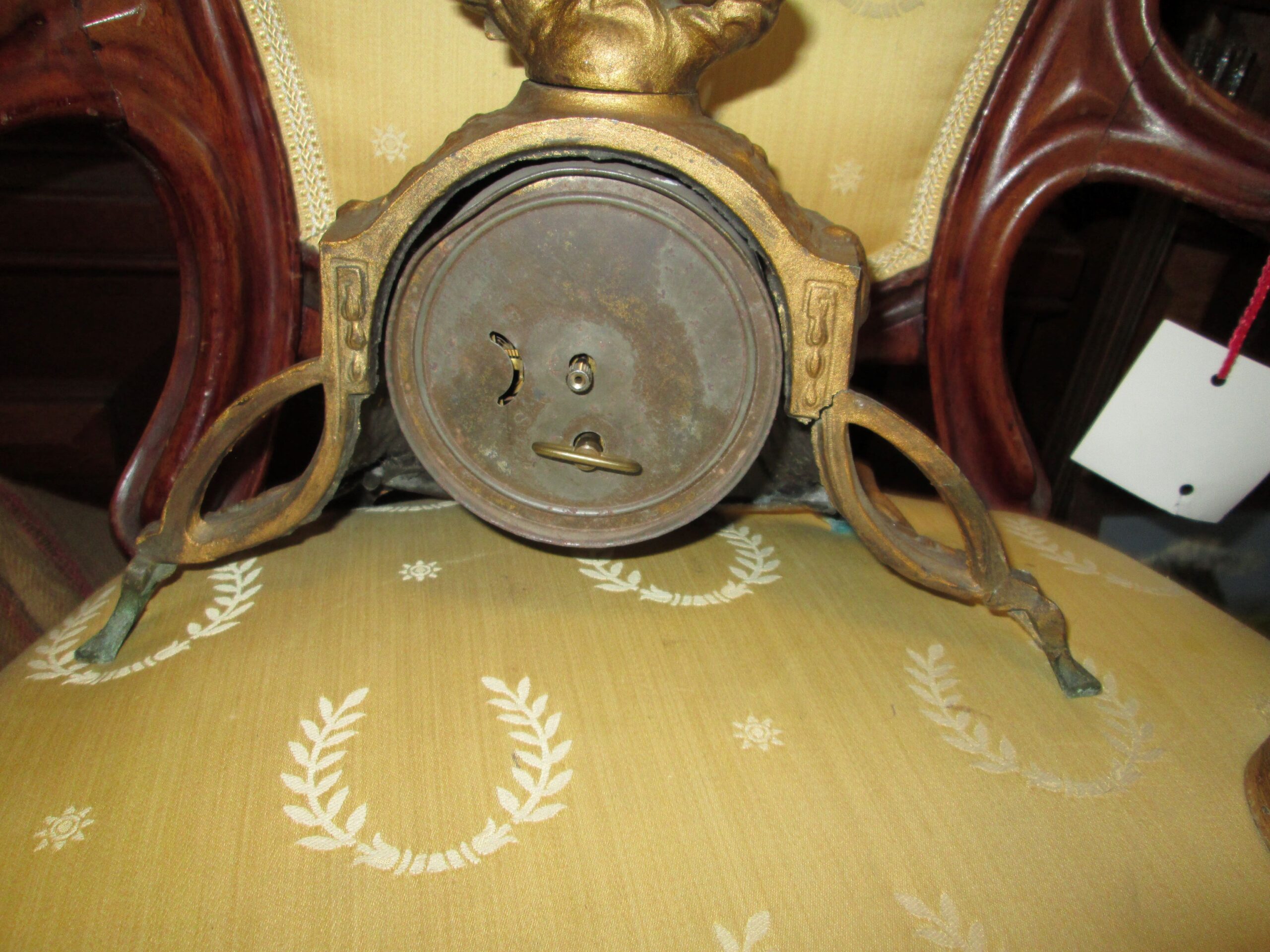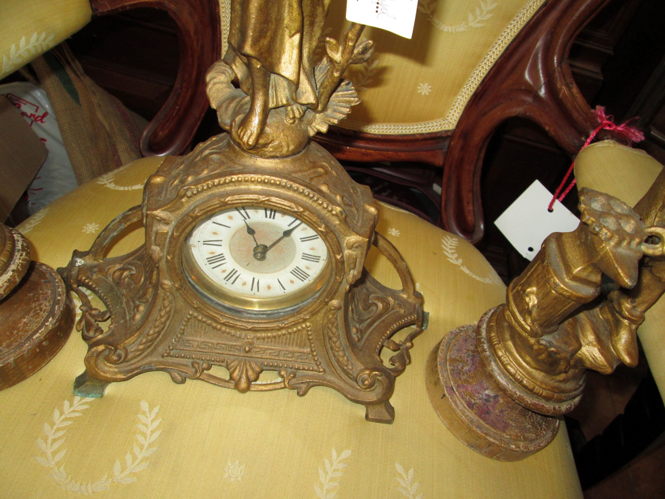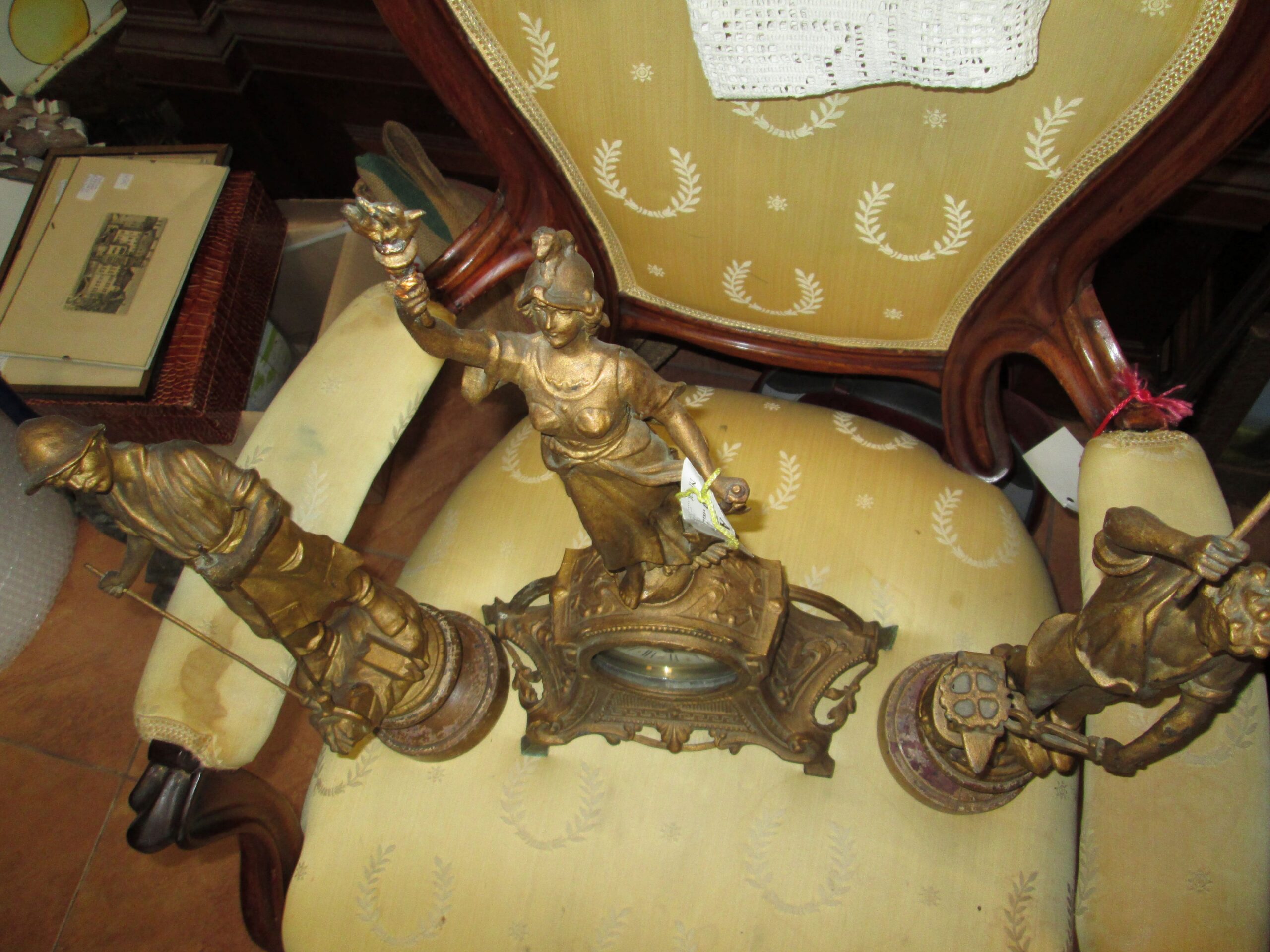 Piękny zegar figuralny wyprodukowany we Francji ok 1900 roku. Obudowa i figury wykonane z cynkalu malowanego na złoty kolor stojące na drewnianych podstawach. Mechanizm to chodzik bez funkcji dzwonka. Obudowa z elementami ozdobnymi typowymi dla okresu secesji. Do zegara w komplecie są dwie figury ,jedna przedstawia kowala , drugi to hutnik. Figura centralna to kobieta z pochodnią. Wysokość zegara z figurą 51 cm , figur bocznych 40 cm. Zegar na chodzie.