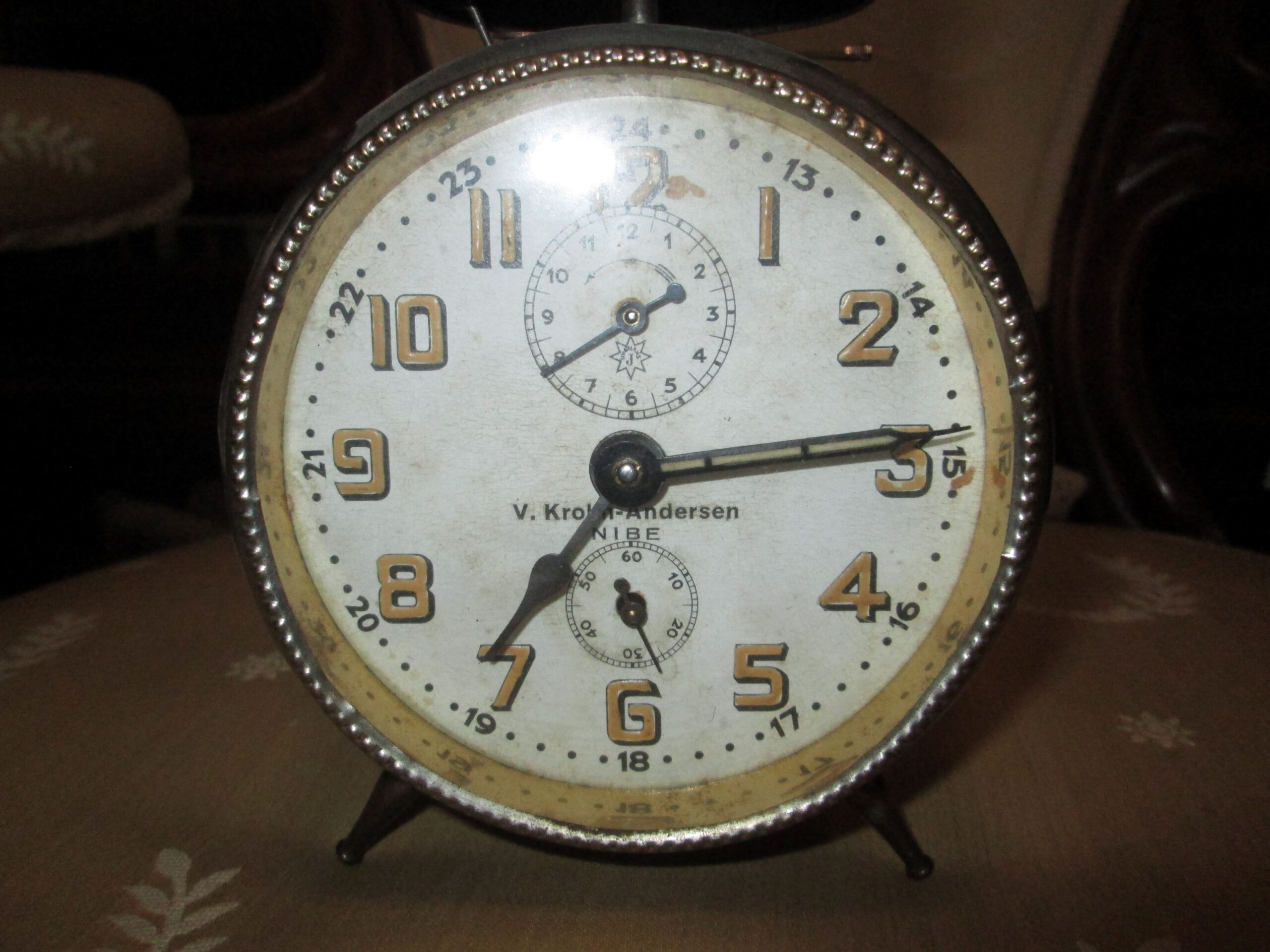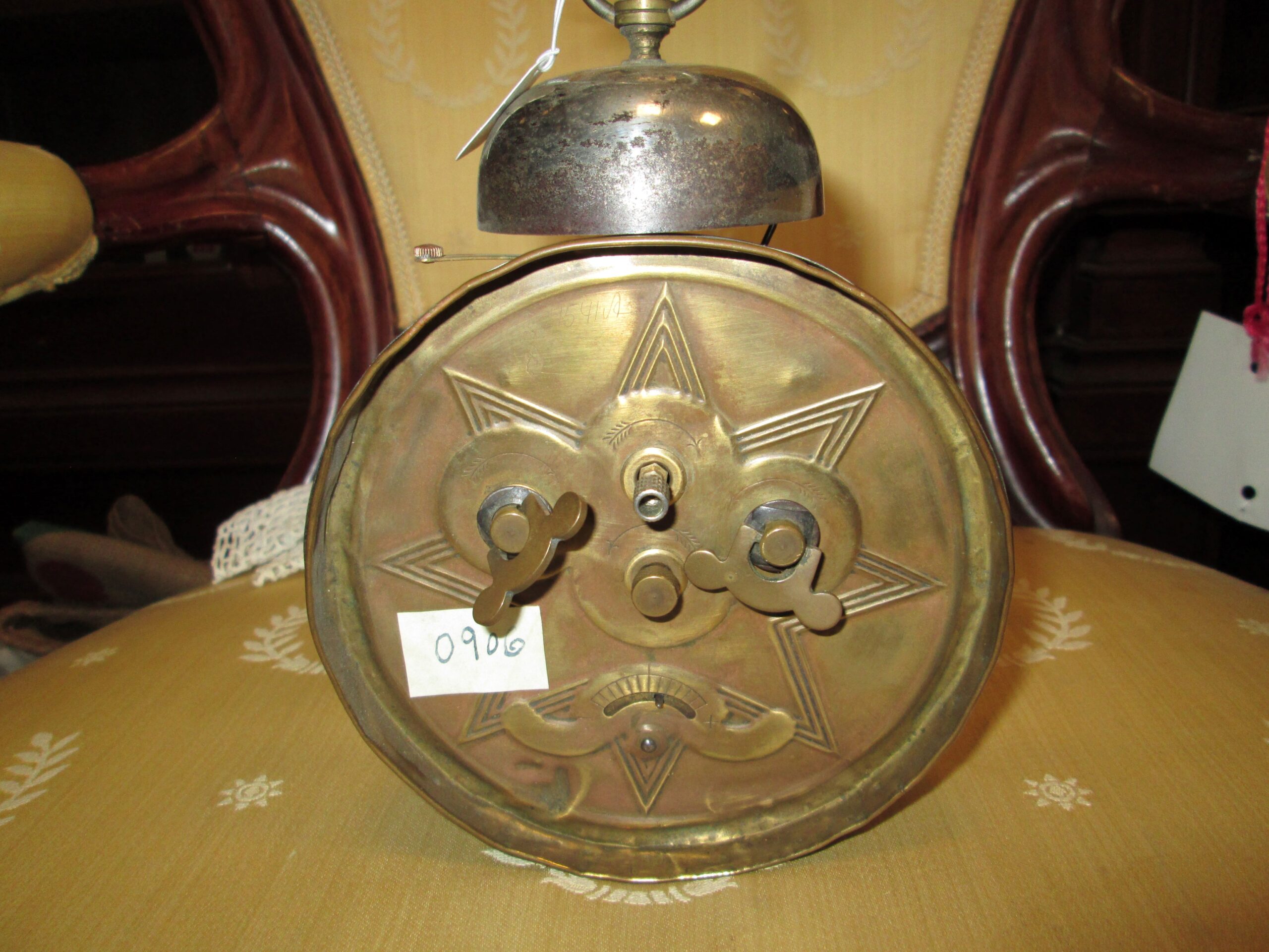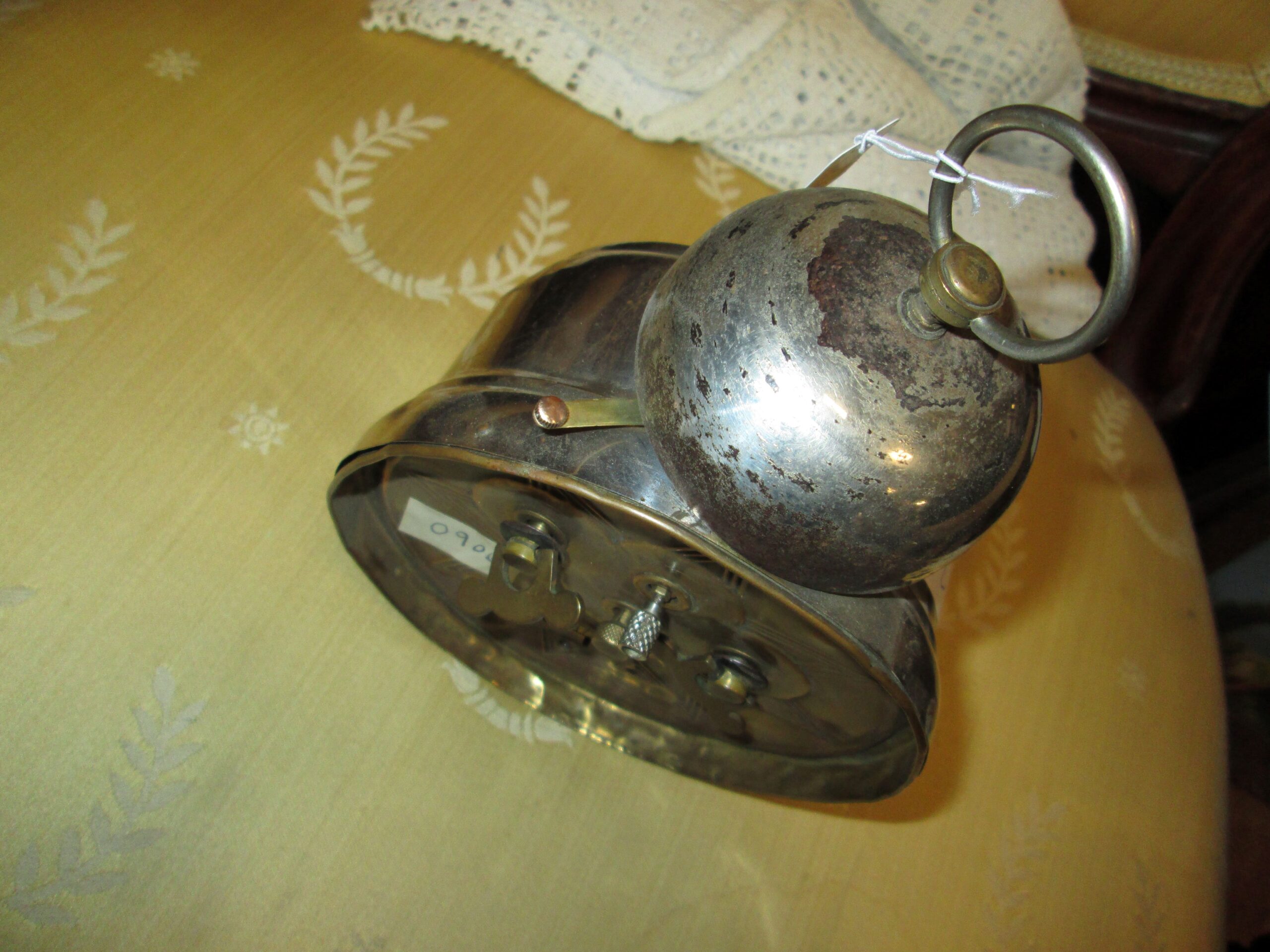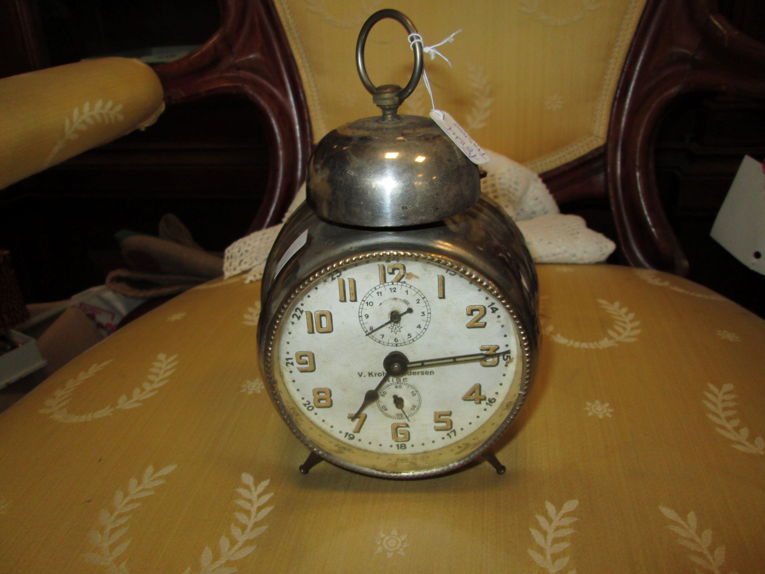 Zegarek budzik firmy Junghans . Obudowa metalowa polerowana. Dzwonek chromowany ze śladami rdzy. Tarcza papierowa sygnowana i podpisana z nazwą sprzedawcy zegarów. Średnica ok 12 cm , wysokość z dzwonkiem ok 17 cm . Zegar na chodzie sprawny. Wykonany w latach 30-tych ubiegłego wieku.