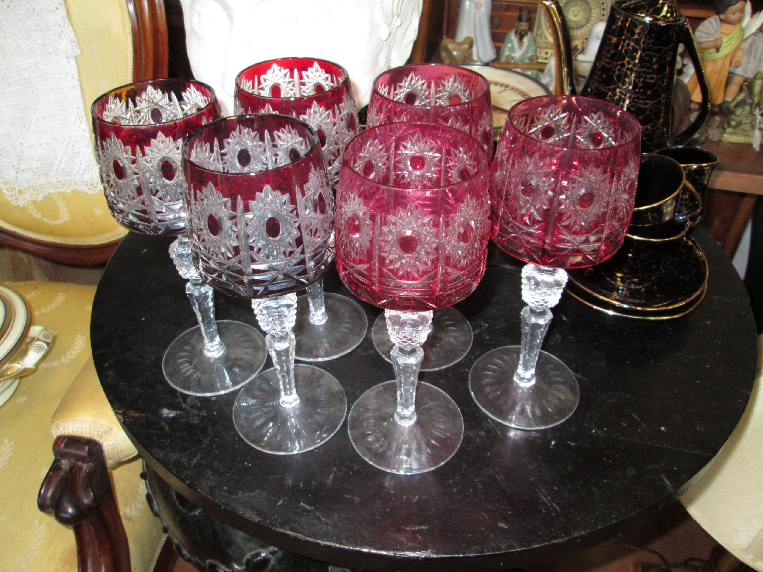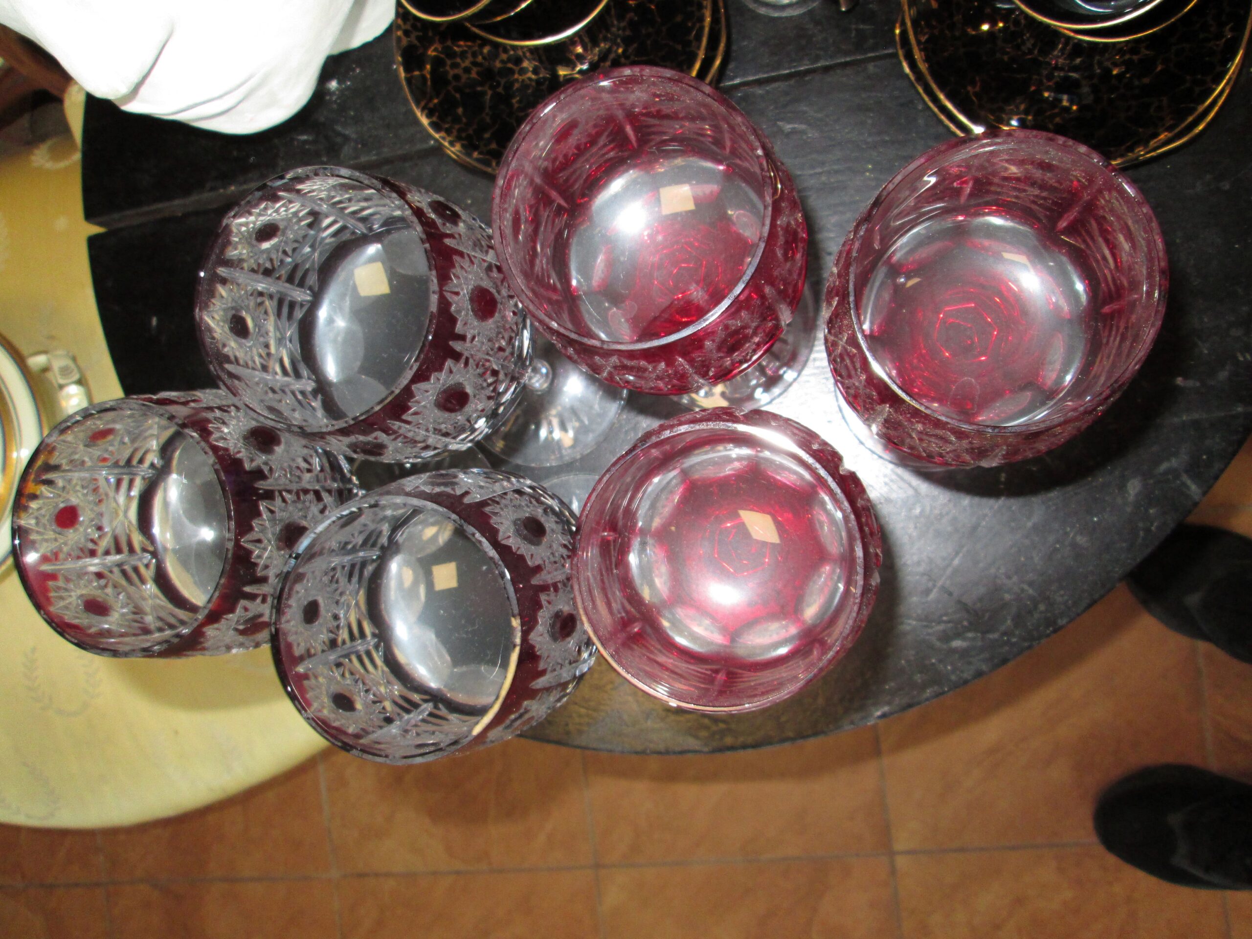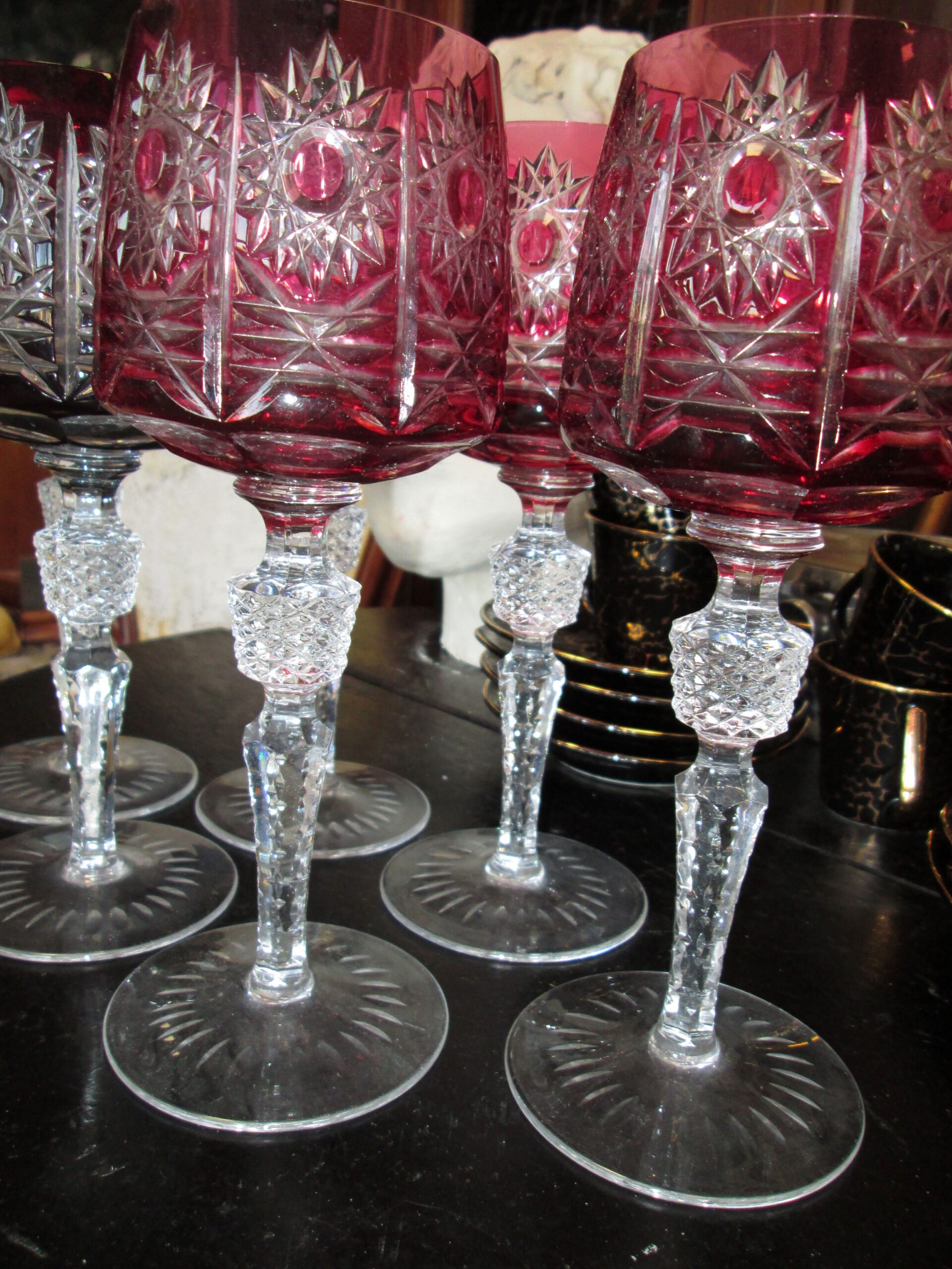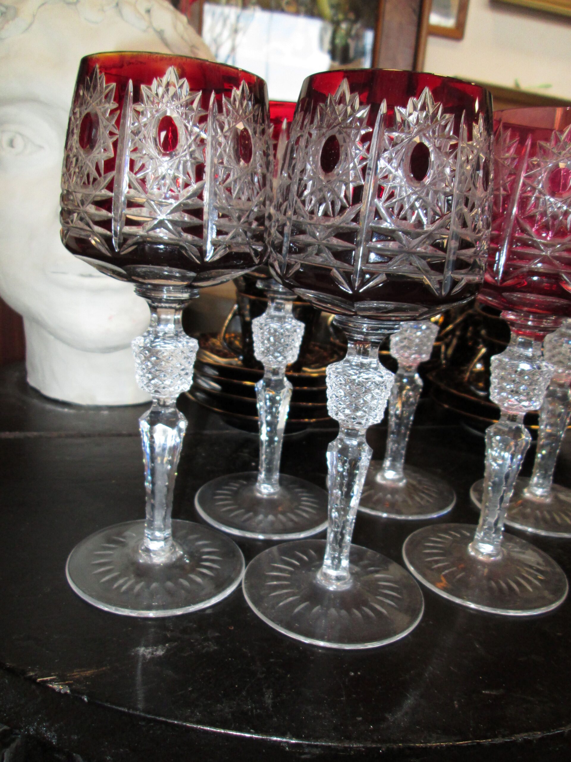 Zestaw 6 ciu kieliszków z kryształu do wina. 2 kolory czarek jedna mocne bordo drugie delikatna czerwień. Piękny ręczny szlif. Wysokość 20 cm , średnica ok 8 cm. Stan idealny. Cena za komplet 6 sztuk.